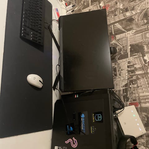 Kaksk hiirimattoa toinen ei näy kuvissa. Ja näytön teline johon saa kaksi näyttöä kiinni.