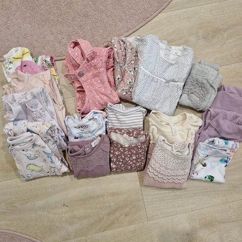 Vaatepaketti: 3 pitkähihaista bodya, 2 pitkähihaista paitaa, t-paita, 4 housut, 2 sukkahousut, uimapuku, shortsit, vetoketjuhuppari, lyhythihainen mekko ja kaksi pitkähihaista mekkoa