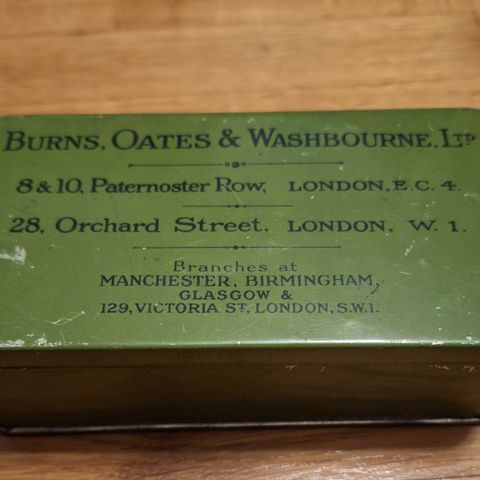 saksalainen, peltirasian koko 8,5 x 4,5 x 2,2cm, sisältö on vajaa, ajan patinaa.