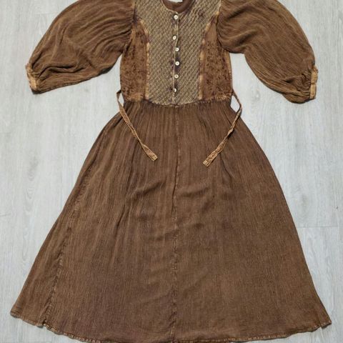 Siistikuntoinen, napitettava vintage henkinen mekko (lapusta ei enää saa selvää). Mekkoa voi tiukentaa vyötäröllä olevalla nyörillä. Mekko näyttää tosi kivalta esim. keltaisten tai punaisten sukkahousujen kanssa. :)