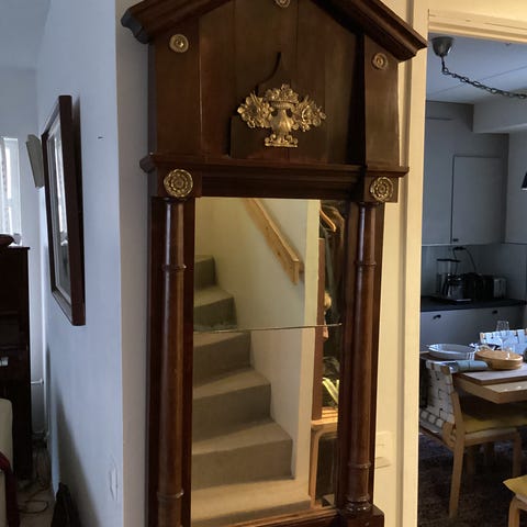Myynnissä kaunis, rokokoo sävytteinen peili jalustallaan. Voi irrottaa myös jalustastaan ja käyttää ns. irtopeilinä, jos tahtoo. Varsinaisen peilin halkaisija ilman kehyksiään 18 cm ja maksimikorkeus jalustasta ylös kehyksen yläreunaan mitaten noin 28 cm. Kehys jonkinlaista metallia, ei mitään kipsiä tai muovia. Metalliosuuden takana iän tuomaa kulumaa/patinaa ja rokokoo kehyksen kiemurakoristeissa pölyä. Ollut itselläni noin 20 vuotta ja ostin aikoinaan itsekin käytettynä, joten ei mikään ihan uusi, joskaan ei antiikkiakaan. Peilipinta moitteettomassa kunnossa. Tosi kaunis, romanttinen, tyylikäs. Sopii hyvin tyylihuonekalujen joukkoon.