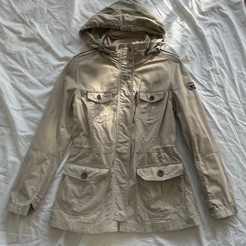 Myydään alle kymmenen kertaa käytössä ollut naisten hupullinen Peak kevät takki.