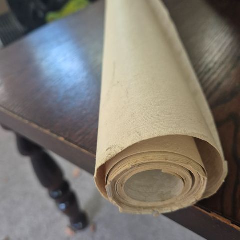 Yksi avaamaton ja yksi vajaa rulla vaaleaa Sandudd Väinö paperitapettia. Rullan pituus 11,2