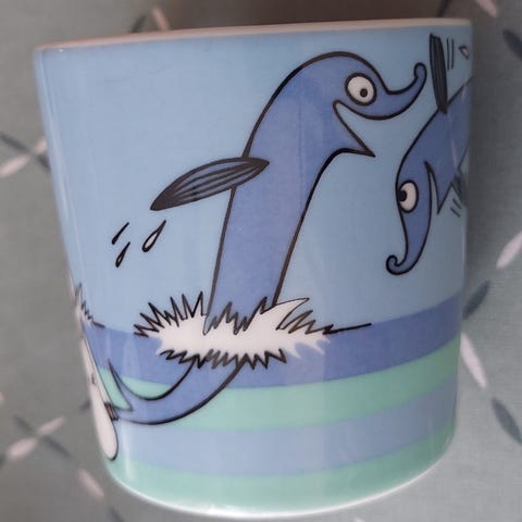 Käyttämättömät muumimukit delfiinisukellus ja perhe tarroilla. 100e yhteensä +postit 8.90e. Erikseen perhe 45e ja delfiinisukellus 65e.