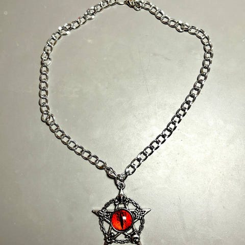 Aika esoteerinen koru jossa monta eri symbolia.
