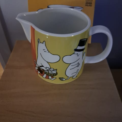 Arabia Muumi Perhe kannu. Priimakunnossa oleva kannu alkuperäisessä laatikostaan. Käyttämätön, ollut vaan koristeena.