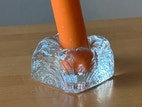 Kynttilänjalka ( koko 4,5 x 4,5 cm ) korkeus 3 cm. Kruunukynttilälle. En tiedä kenen valmistama. Alareunassa ( pohjan reunassa ) pieniä kolhuja ( en saanut kuvaa ) Koska kynttilänjalan pinta on kuvioitu, niin kolhut eivät näy. Pitää tunnustella, jotta tietää missä kohtaa ne ovat. Muutoin hyväkuntoinen ja siisti.