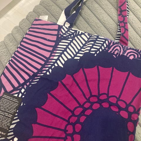 Marimekko, apukassi, puuvillakassi, kangaskassi, siirtola puutarha, kauppakassi, koulukassi