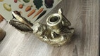 Myydään A lot merkin uusi koristeena vain hetken ollut, aika kookas kynttilänjalka. Tämä on tällainen jotakuinkin kullanvärinen ehkä, kimalteleva ja esittää pyllähtänyttä pupua. Korkeus on noin 15cm. Paino on 222g. Materiaalia en tiedä. Hiukan tällainen rosoinen on tyyliltään. Aika hauska.