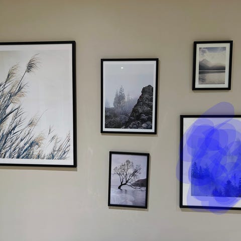 Kaksi taulua "Tyyni vesi". Työt ovat Naturan, Tampere valmistamia painokuvia. Töiden korkeus 25 cm ja leveys 25 cm. Kehykset 38 X 38 cm.
