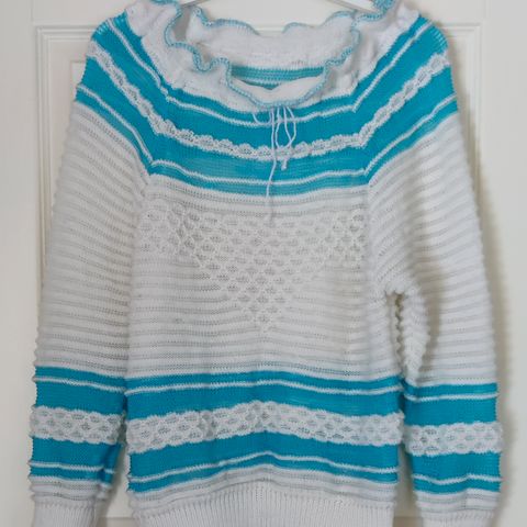 Vaaleansininen neule kirjonnalla ja koriste napeilla.Koko L.Hinta 5€+ lähetys.