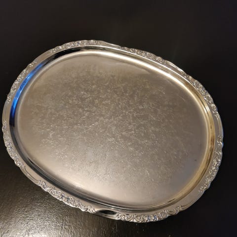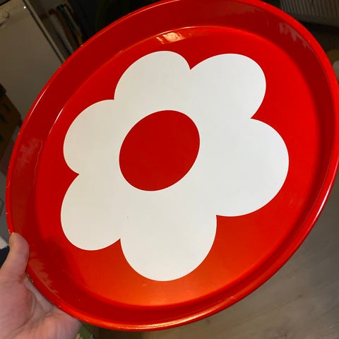 Myydään kuvan punainen metalli retro tarjotin, halkaisija 30,5cm. Tarjottimessa valkoisia sydämiä.
