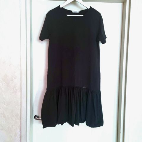 Musta trikoomekko, merkki ABOUT The sensology of wear, koko L, epäsymmetrinen helma, isot taskut, rinnanympärys 96 cm, pituus 110 cm. Käyttämätön.