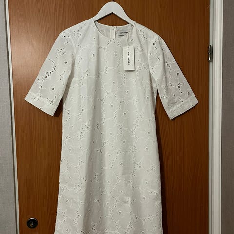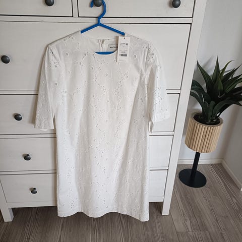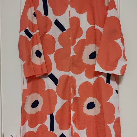 Kaksissa juhlissa päällä ollut kaunis mekko. Takana vetoketju. Ryppyinen, mutta muutoin oikein siisti.