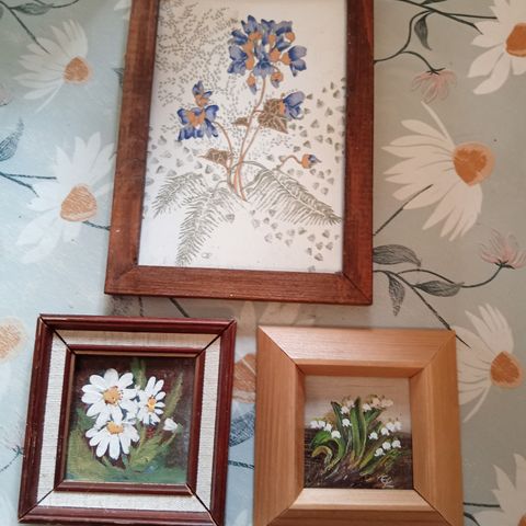 Ylimmäinen Isoin Vihreä kehyksinen Kukka Taulu, kehyksen ulkomitta 20x25cm 8 euroa. Vas. Vihreä kehyksinen Kastelu kannu Taulu, kehyksen ulkomitta 12x16,8cm 8 euroa. Alimmaiset Sydän Taulut Johan 4 euroa/kpl.
