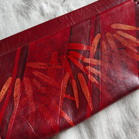 Kaunis olkalaukku jota voi käyttää myös clutch laukkuna. Ihana metallinhohtoinen kuparinsävyinen vintage henkinen malli kiiltonahkreunoilla. Materiaali perferoitua keinonahkaa, arviolta 80-luvulta. Koko 29 x 16 x 4cm.
