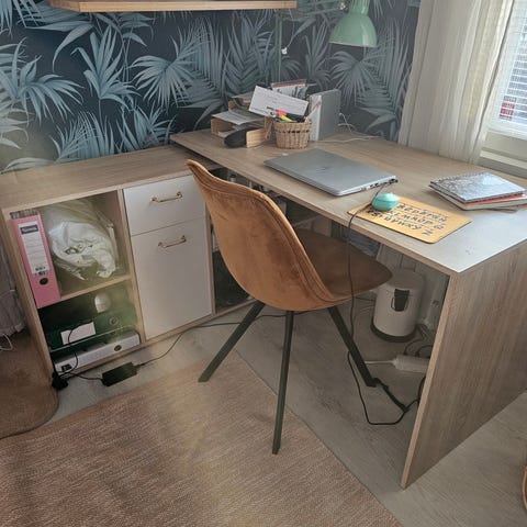 Tämä kulmatyöpöytä on sekä tyylikäs että käytännöllinen lisä toimistoosi tai kotiisi. Ajaton muotoilu yhdistyy käytännöllisiin säilytysratkaisuihin, mukaan lukien erityinen lokero tietokoneellesi. Pöytä on suunniteltu kestämään, ja se on valmistettu huolella ja ammattitaidolla, taaten pitkäikäisyyden ja tukevuuden.