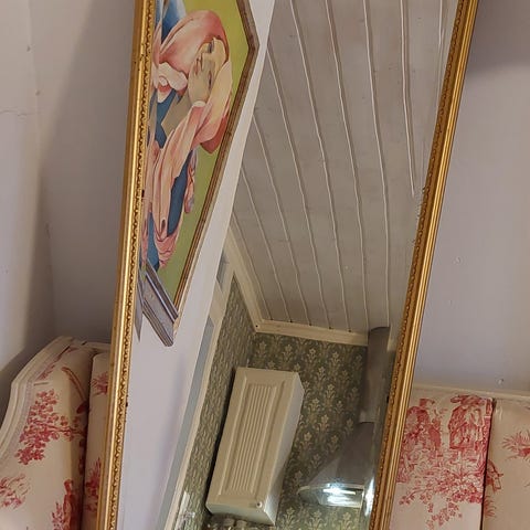 Kaunis vihreän harmaalla kehyksellä oleva peili.54x84cm.(ulkomitat)Antiikkinen drapeeraus maalauksessa.