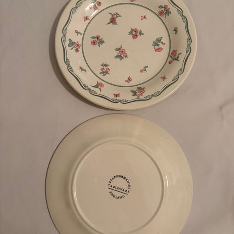 Laadukasta englantilaista posliinia 6 kpl mukeja alusineen. Kunto erittäin hyvä.