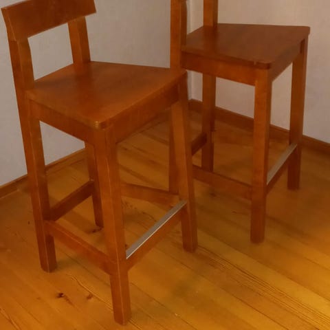 Hyvä kuntoiset, täysipuiset ja jämäkät korkeat tuolit. Istuinkorkeus 65cm.