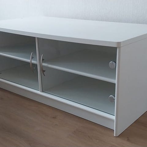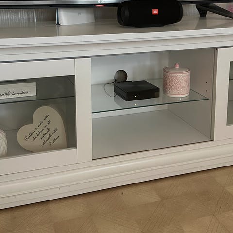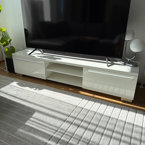 Myydään valkoinen, painava TV-taso, jossa on päällä lasikansi. Siistin näköinen päälle päin, mutta jonkin verran löytyy vikoja.