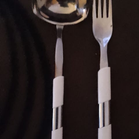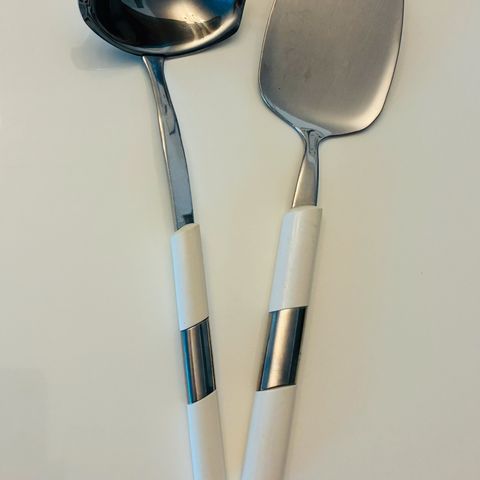 Kastikekauha ja tarjoiluhaarukka, sekä 2 tarjoilulusikkaa joista toinen käyttämätön ja toisessa kuvassa näkyvä virhe valkoisessa osassa