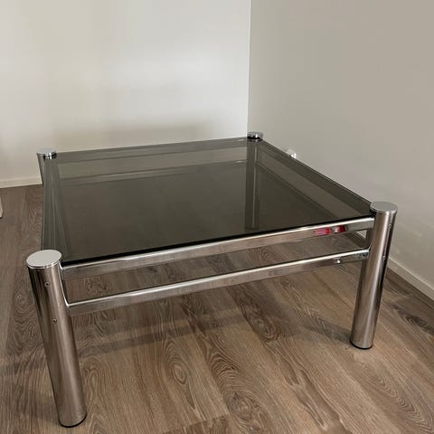 Sohvapöytä 70-luvulta,savulasilla ja pyörillä.