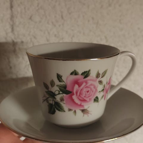 Söpö sydänkuvioinen kahviastiasto. 8 kahvikuppia, 8 tassia ja 8 aluslautasta.
