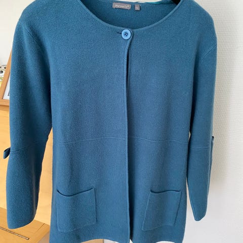 Turkoosi neulejakku, koko L. 65% polyesteria, 35% viskoosia. Merkki: Esprit.