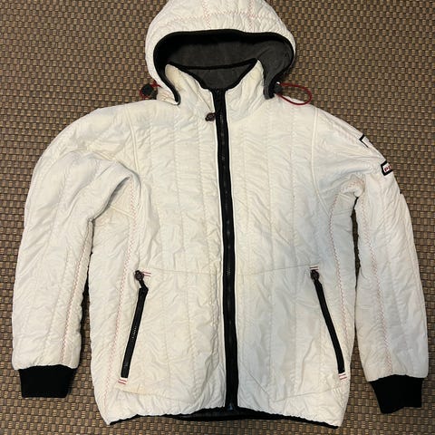 Takissa selkäpuolella reikä ja molemmissa hihoissa pienet tahrat ja toisessa hihassa myös pieni reikä. Näkyy kuvissa. Myös päävetoketjun vetimestä on irronnut muovinen osa. Takki on pesty.