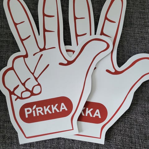 Käteen sujautettava jättihanska, fanikäsi, tekstillä SUOMI. Koko noin 50x30 cm. 2 kpl yhteensä 2 euroa.