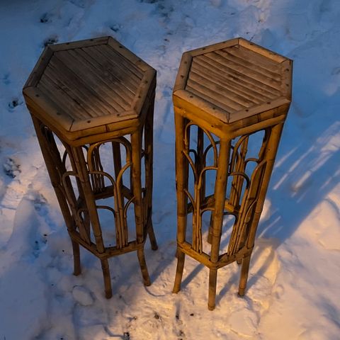Myydään kuvassa näkyvät rottinkiset kukkapöydät 2kpl. Korkeammasta pöydästä puuttuu lasi. Myydään molemmat yhteishintaan:60€.