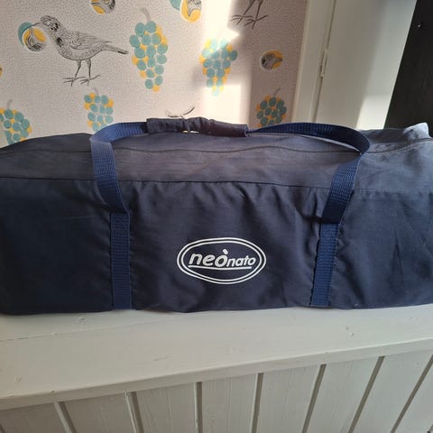 Matkasänky verkkoreunoilla. Sängyssä on harmaat kangasosat ja vaalea sisäpohja. Pitkillä sivuilla on verkkomateriaali, joka mahdollistaa ilmanvaihdon. Pohja on taitettava kuljetusta ja säilytystä varten. Mukana tulee säilytyspussi. Ollut käytössä yhdellä lapsella.
