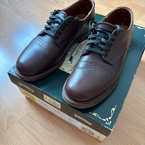 Kaunista käsityötä USA:sta. Klassiset Florsheimin Royal Imperial malliston longwingit. 92604 Kenmoor. Juuri tullut suutarilta, jossa vaihdettu Vibramin kokopohjat sekä ommeltu sisä kantaan uudet nahat. Kunto siis loistelias ja paksumpi Vibramin pohja tekee näitä sopivan vähän huonommillekin keleille. Puhdistettu ja vahattu.
