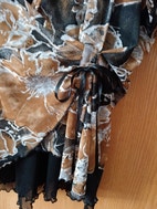 Upea ruskean/musta värinen tunika. Miehustassa musta aluspusero. Helmassa ja hihan suissa Hienot frilla.