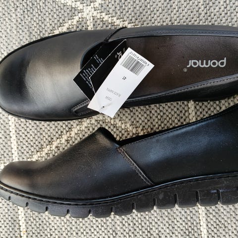 Mustat Pomarin kävelykengät. Mokkaa, pinta oikein hyvässä kunnossa eikä kulumaa näy juuri ollenkaan, vähän käytetyt. Koko 40 ja vastaa hyvin kokoaan, hyvät jalassa. Gore-tex eli pitävät myös vettä. Villasukat kenkien sisällä vain pitämässä kengän muotoa :)