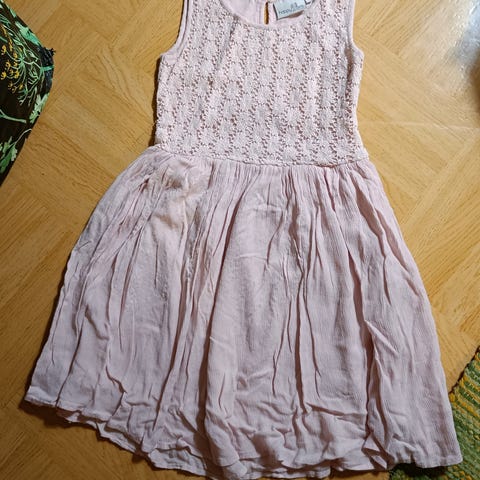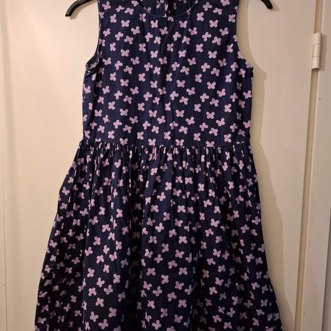 Kukkamekko, sisällä vuorihame, sifonkityyppinen päälliskangas. Koko noin 146, voi olla isompikin, kokomerkintä puuttuu