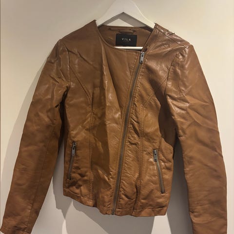 Ruskea Keinonahkatakki on käytetty, mutta on siisti.