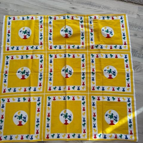 Ehjä ja siisti keltainen vanha (retro) pääsiäisliina. Liinan koko n. 85 x 90 cm. Mukaan saa saman sarjan pienen liinan (26 x 26 cm) jossa pieni tahra (katso ensimmäinen lisäkuva). Hinta 5 e. Voin myös postittaa, jolloin postimaksu on kirjeenä 5,50 e.