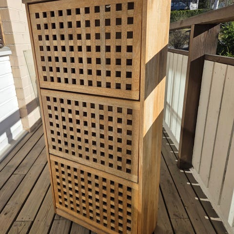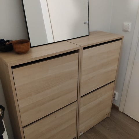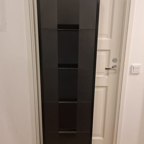 Ikean musta-ruskea kenkäkaappi. Mitat: L 49cm , S 28cm, K 92,5cm. Ilmeisesti taustavaneri puuttuu ja muutama hylly lokerikon sisältä. Päällisessä vähän naarmuja ja kolhu, sivussa ruuvin reiät (kaikki nämä näkyy kuvissa)
