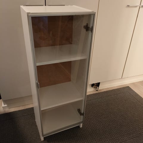 VHS-kaseteille mitoitettu pieni vitriinikaappi lasiovilla. Ehjä.