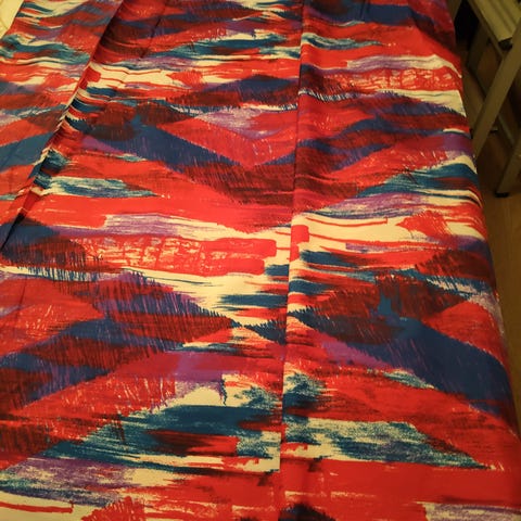 Raitainen kangaspala. Materiaalista ei täyttä varmuutta, mutta vaikuttaa satiinilta. Pala kuvassa taitettuna keskeltä kahtia. Kokonaan avattuna palan leveys 145 cm ja pituus 102 cm.