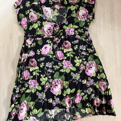 100 % viskoosia. Vyötäröllä hieman muotoa antava kuminauha. Ks "Patterned short sleeve dress with flounce"