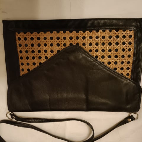 Pehmeää nahkaa, musta, hihnallinen sievä kukkaro iltalaukku.