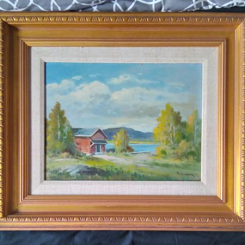 Uuno Soldanin levylle maalaama kaunis järvimaisema. Signeeraus "U. Soldan", ei vuosilukua. Erittäin hyväkuntoinen kauniita kehyksiä myöten.