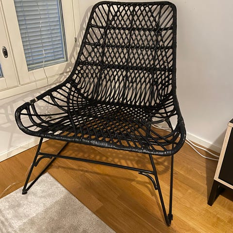 Myyntiin kaunis rottinkinen nojatuoli, väriltään musta.