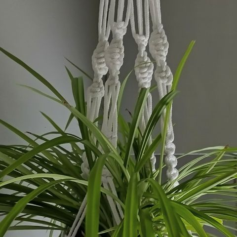Pitkä luonnonvalkoinen seinä-amppeli. Pituus ilman ripustusnauhaa puusta hapsujen alaosaan 73cm ja ruukun kanssa 70cm. Sopii n.17cm ruukulle. Hinta 9e.