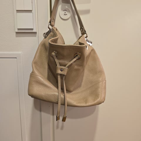 Tilavuus n 7 l. Nahka laukku puuvilla kahvoilla. Erittäin pehmeää nahkaa.