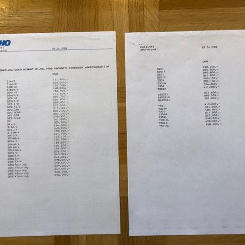Myydään Vehon hinnasto BMW henkilöautot 1.9.1988