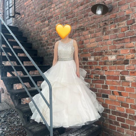 Mekko on lyhennetty ammattiompelijalla ja sopii noin 155-165 cm tanssijalle, Helmaan on jätetty vähän pidennysvaraa, joten menee mahdollisesti pidemmällekin tanssijalle. Mekon selkäpuolella on säädettävät nyörit. Sovittaminen mahdollista. Vannehame (ovh 60 e) sisältyy hintaan.
